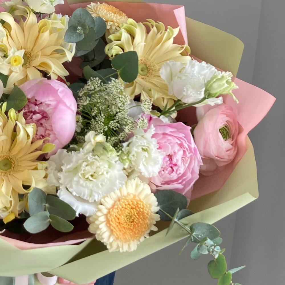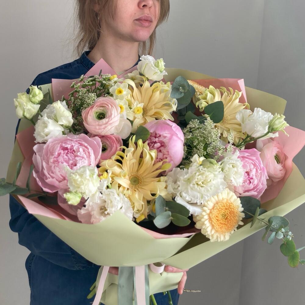 Весенний, душистый букет с пионами, нарциссами, кучерявыми герберами, зонтиками, ранункулюсами, лизиантусом и эвкалиптом.